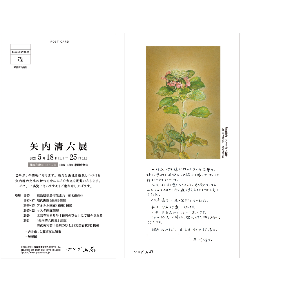 2年ぶりの個展になります。新たな画境を追及しつづける矢内清六先生の新作を中心に30余点を展覧いたします。