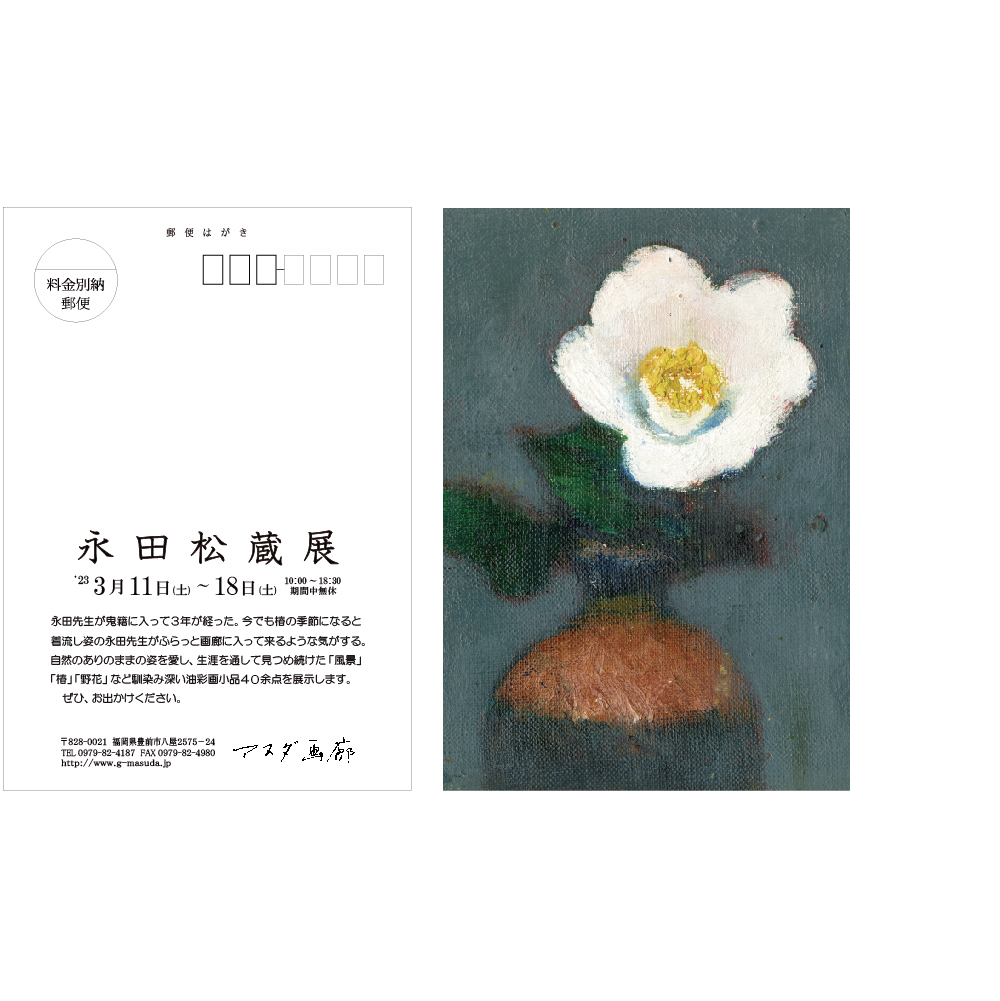 永田先生が鬼籍に入って3年が経った。今でも椿の季節になると着流し姿の永田先生がふらっと画廊に入って来るような気がする。自然のありのままの姿を愛し、生涯を通して見つめ続けた「風景」「椿」「野花」など馴染み深い油彩画小品40余点を展示します。