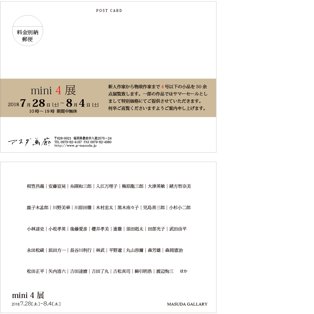 新人作家から物故作家まで4号以下の小品を50余点展覧致します。一部の作品ではサマーセールとしまして特別価格にてご提供させていただきます。