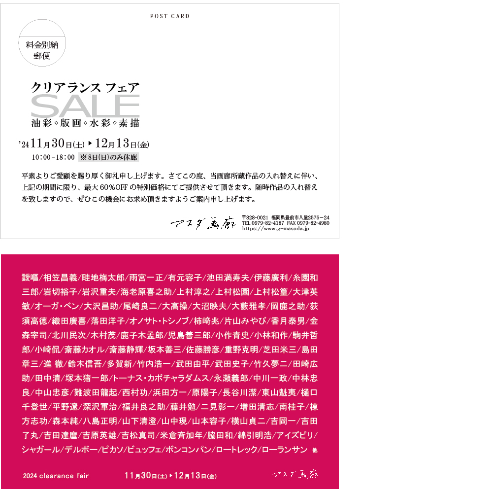 画廊所蔵作品の入れ替えに伴い、上記の期間に限り、最大60%OFFの特別価格にてご提供させて頂きます。
