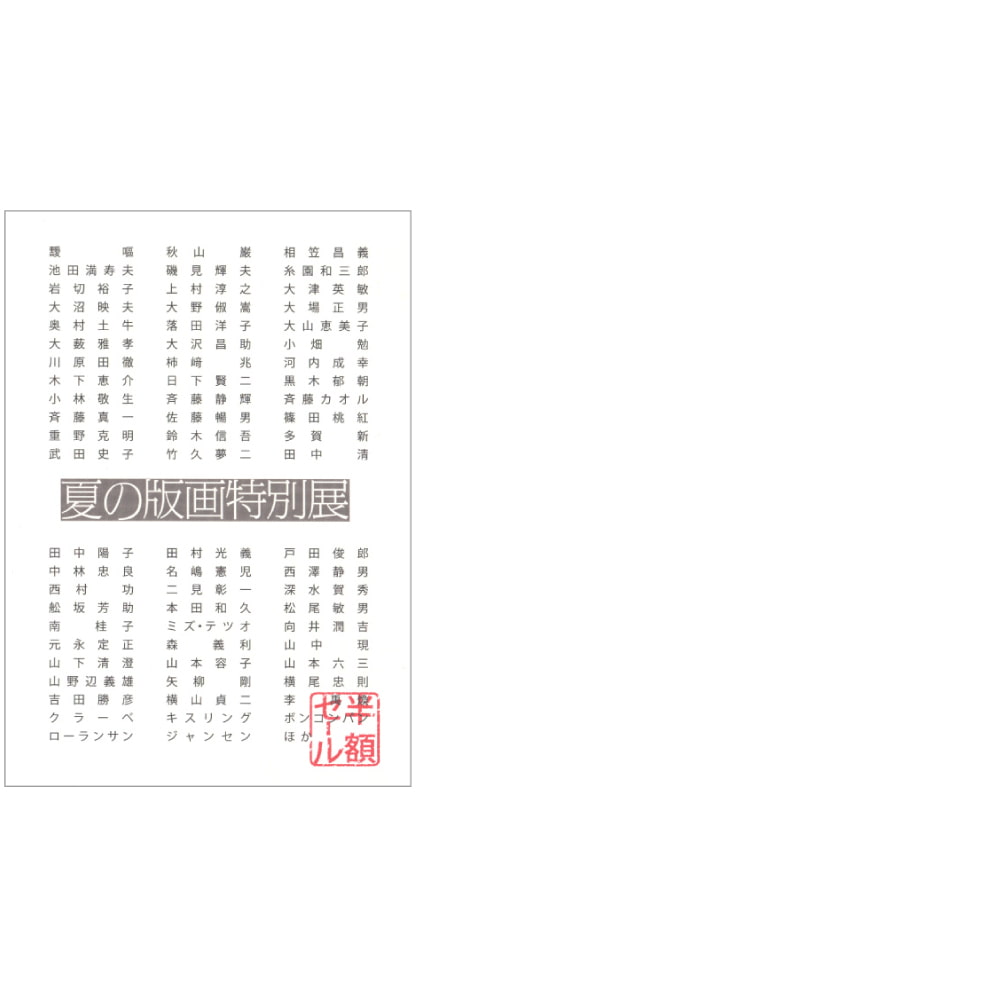 今回の特別企画展は開廊40周年記念第3弾として、 日頃のご恩に感謝の意を込めまして、コレクションを中心に200余点の版画作品をこの期間中に限り通常価格の半額にてご奉仕いたします。